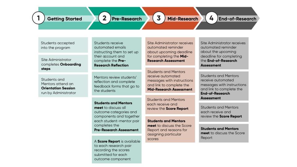 Site administrators (usually program directors or coordinators) learn how to use the EvaluateUR method by completing the onboarding steps that illustrate and explain how to configure their program dashboard (e.g., setting assessment completion dates, adding student-mentor pairs, adding optional outcomes or questions). Once it is set up, the dashboard shows all the student-mentor pairs and the sequence of steps to be completed by each pair. Clicking inside the box for any student-mentor pair expands the box and lists what actions happen at each step of the process. As steps are completed, they change color from gray to orange to green, making it easy to see what steps are completed (green), what action is required to complete the current step (orange), and steps that have not yet been started (gray). This helps the administrator track the progress of each student-mentor pair. The last activity is running an orientation session to help students and mentors understand the purposes and advantages of EvaluateUR. For E-CURE and E-Compete, the CURE instructor or ROV team advisor completes the onboarding process to learn how to set up the dashboard and introduce the method to their students. For all variants, selecting the ‘activate’ option on the dashboard results in an automated message alerting students to begin the Pre-Research steps.