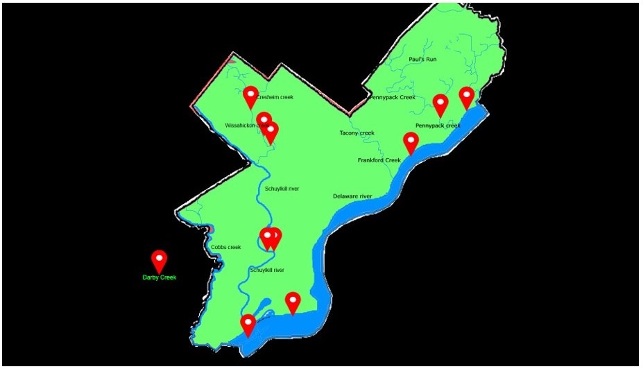 The figure depicts a map illustrating the locations in the Philadelphia region where water samples were collected. The map displays the geographical area of Philadelphia County. Various points or markers (red) are plotted on the map, indicating the specific locations where water samples were taken. Water samples were taken from the same geographic location pre and post storm events. Samples were collected in sterile 150mL bottles prior to processing in the laboratory and were kept at 4°C for no more than 3 days.