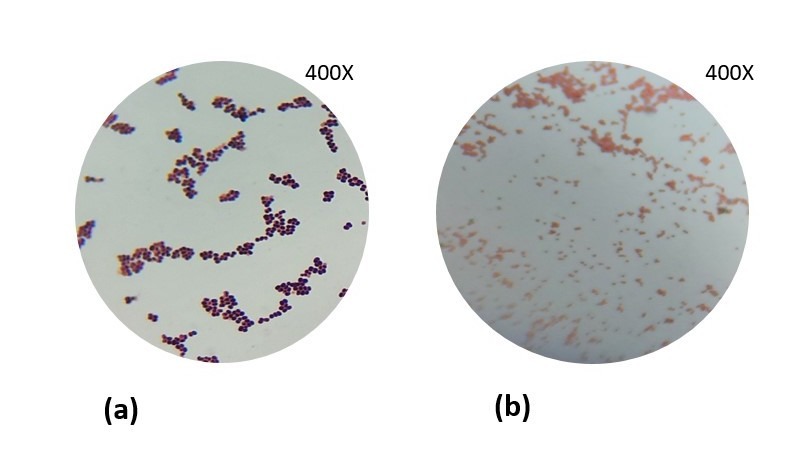 Gram Stain of Representative Microorganisms from Philadelphia County Surface Waters (Fig. 2.). TSA (Tryptic Soy Agar) plates were inoculated with 100 mL of SW from various samples. Representative colonies were picked from each TSA plate, were fixed to glass slides, and stained using the gram stain protocol [36]. Images were taken at 400x using a Leica fluorescent microscope using brightfield settings. Fig. 2a shows an example of a gram positive bacteria from the Wissahickon Creek. Fig. 2b shows an example of a gram negative bacteria from the Wissahickon Creek.