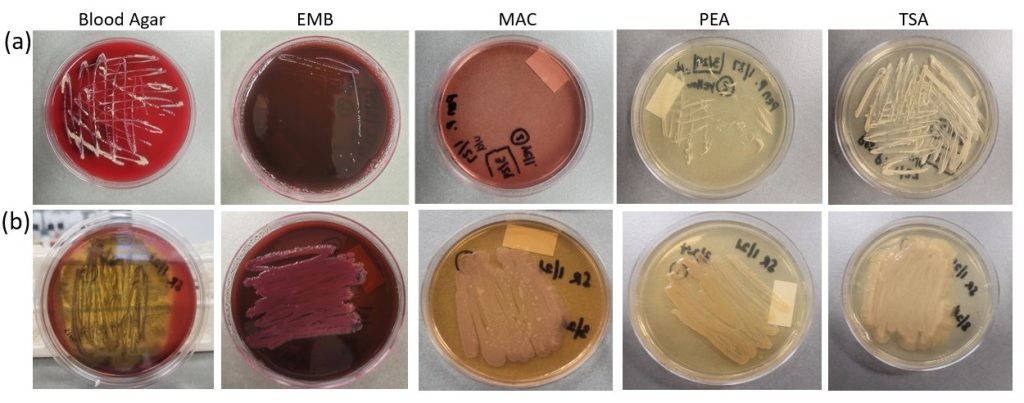 Figure 3 depicts the growth characteristics of isolated colonies from microorganisms obtained from different water sources (Pennypack Creek (a) and Schuylkill River (b)) when cultured on specific types of media. By utilizing various differential and selective media, one can gain insights into the hemolytic activity, lactose fermentation capabilities, and Gram characteristics of microorganisms. This information is crucial for identification and classification purposes, providing valuable insights into the diversity and potential pathogenicity of the microorganisms in the respective water sources. TSA (Tryptic Soy Agar) is a general-purpose medium that supports the growth of a wide range of microorganisms and serves as a positive control for growth and appearance, allowing for a comparison of growth characteristics between the specific media types mentioned above. The Pennypack Creek sample appeared stark white with heavy growth while the Schuylkill River sample appeared off white with heavy growth. Blood Agar (hemolysis): This medium is used to determine the hemolytic activity of microorganisms. By observing the growth characteristics of the isolated colony from Pennypack Creek on Blood Agar (Figure 3a), no hemolytic activity was observed. The Schuylkill River Sample (Figure 3b) demonstrates B-hemolysis of red blood cells. Eosin Methylene Blue (EMB) Agar (Lactose fermentation): EMB agar is a selective and differential medium used to identify organisms that can ferment lactose. Lactose fermentation can indicate the presence of certain types of bacteria, such as coliforms. By assessing the growth characteristics of the isolated colony from Schuylkill River on EMB agar (Figure 3b), the isolated bacteria could ferment lactose while the sample from Pennypack Creek does not ferment lactose (Figure 3a). MacConkey Agar (Gram isolation): MacConkey agar is both a selective and differential medium used to isolate and differentiate Gram-negative bacteria, particularly those that can ferment lactose. It contains specific indicators that help identify lactose fermentation and distinguish between different types of bacteria. The growth characteristics of the isolated colony from the Schuylkill River showed heavy growth via lactose fermentation (Figure 3b) while the isolated colony from Pennypack Creek did not ferment lactose. PEA (Phenylethyl Alcohol) Agar (Gram isolation): PEA agar is a selective medium used to isolate Gram-positive bacteria while inhibiting the growth of Gram-negative bacteria. By observing the growth characteristics of the isolated colony from Schuylkill River on PEA agar the heavy growth indicates it is Gram-positive (Figure 3b). However, the inhibited growth of the Pennypack isolate compared to TSA growth indicates the organism could be gram negative.