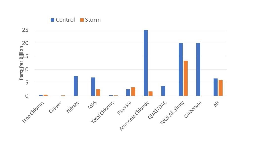 Storm Events Alter Levels of Chemicals Present in Surface Waters from Schuylkill River (Fig. 5.). The data indicates that the influx of water from storms leads to a decrease in the relative concentrations of chemicals overall. Additionally, the levels of free chlorine, copper, and fluoride showed an increase two days after the storm. The pH of the water also decreased post-storm. These findings suggest that storm events have a significant impact on the levels of different chemicals present in the Schuylkill River. This alteration in chemical composition may potentially contribute to changes in biodiversity in the river ecosystem following storm events.