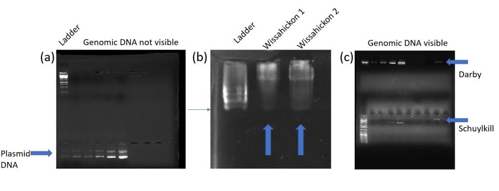 To determine the biodiversity of Philadelphia waterways and to analyze microbial diversity and functional metagenomes, genomic DNA was isolated from various waterways. Firstly, water samples were filtered through 0.2µm filter towers. The filters were sterilely removed, minced, and the genomic DNA was extracted using the PureLink Microbiome DNA Purification kit. Subsequently, the 10μL of extracted DNA was electrophoresed on 0.5% agarose gels along with increasing concentrations of plasmid DNA to serve as a DNA concentration control (Figure 6a) and no genomic DNA was visible. Since no DNA was visible, water was cultured, and bacterial colonies were used to extract genomic DNA from The Wissahickon Creek (Figure 6b). This verified that the genomic DNA extraction kit worked. A repeated attempt was made to extract genomic DNA from water samples (Figure 6c). This demonstrated that for the Darby Creek and Schuylkill River samples, significant DNA was present in the samples (Figure 6c). Subsequent quantification using a NanoDrop 2000 UV Visible Spectrophotometer (Catalogue # ND-2000, Thermo Fisher, Waltham, MA) indicated that genomic DNA was present in all samples in quantities significant enough for metagenomic sequencing (data not shown).