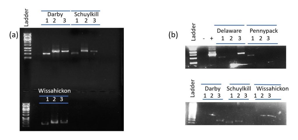 Figure 7 demonstrates the PCR amplification of the 16s rDNA gene as a preparatory step for DNA sequencing and classification of microorganisms. The 16s rDNA gene serves as a fingerprint for identifying and classifying microbial organisms. In this study, genomic DNA extracted from pre-storm waterways in Philadelphia County was used as the template for PCR amplification. Mastermixes containing primers that span the entirety of the 16s rRNA gene were employed for the PCR reaction. The resulting PCR products were separated by electrophoresis on a 2% Agarose gel and visualized using a V3 Western Workflow System. The full 16s rDNA gene was successfully amplified from the Darby Creek, Wissahickon Creek, and Schuylkill River samples from genomic DNA samples gathered pre-storm event (Figure 7a). The full 16s rDNA gene was successfully amplified from the Darby Creek, Pennypack Creek, Wissahickon Creek, Schuylkill Creek, and Delaware River from genomic DNA samples gathered 2 days post-storm event (Figure 7b). Since we were not able to amplify the 16s rDNA gene for all samples gathered pre and post storm, it was decided that genomic DNA samples would be sent to the sequencing facility (GeneWiz Azenta, South Plainfield, NJ) for 16s rDNA gene amplification prior to sequencing.