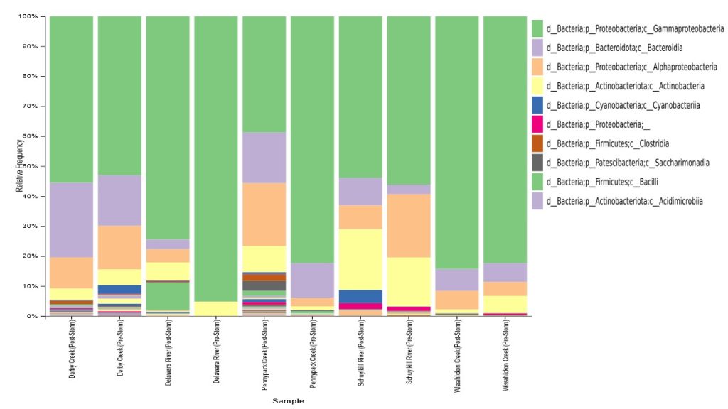 Figure 8 shows the bacterial community composition of surface water samples from the Darby Creek, Pennypack Creek, Wissahickon Creek, Schuylkill River, and Delaware River Pre and three days post storm events. Bacteria are identified to the Class taxonomic level. SW samples were collected during periods of no precipitation and three days post significant precipitation. Initial analysis of the data at the Level 3 (Class) taxonomy was used to demonstrate the differences observed between samples. Levels of various taxa changed dramatically between pre and post storm samples, with the least diversity in the Delaware River SW sample. This data correlates with previously published data [12]. where the urban samples demonstrated the least microbial diversity. Furthermore, the most prevalent class of microorganisms present was from the class proteobacteria gamma proteobacteria. This class includes potential pathogens such as Escherichia coli, Yersinia, Salmonella, and Salmonella [37].
