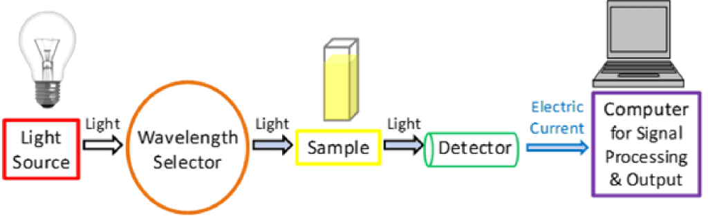In this paper, the Ultraviolet–visible (UV-Vis) spectrum of nanoparticles with the diameter of 40 nm AuNPs, 40 nm protein Streptavidin-conjugated AuNPs, 40 nm AgNPs, and ~42 nm synthesized Ag@AuNPs (30nm diameter Ag core/6nm Au shell) was obtained and compared. Additionally, TAS of AuNPs and its peak specific wavelengths absorbance decay in time are also collected and analyzed. UV-Vis spectrophotometer is an instrument that measures the amount of light absorbed or transmitted by a sample as a function of wavelength. (Figure1) [15].