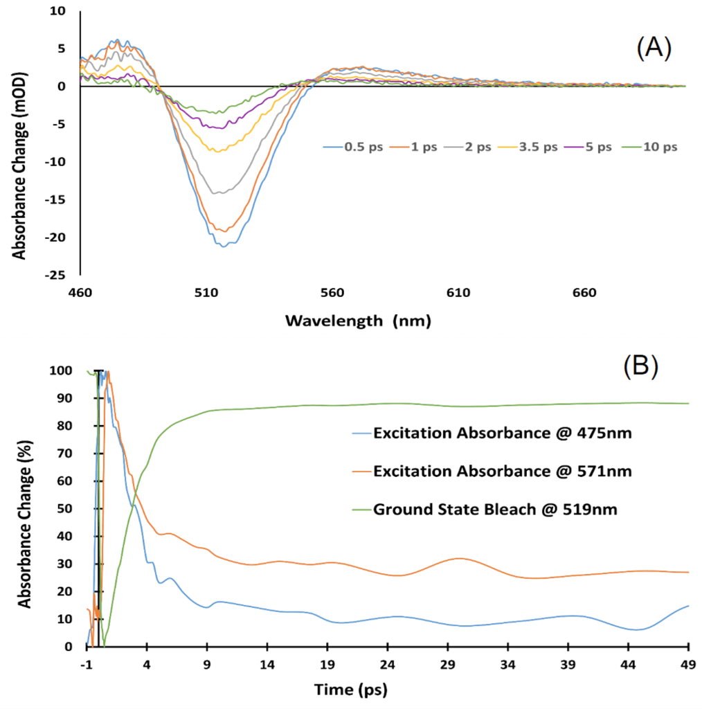 Understanding the electron activity as excitation occurs in the molecule is crucial for application development. However, the excitation and relaxation of electrons happen on a femtosecond to an attosecond scale, making studying electron activity especially difficult. Remarkably, Transient Absorbance Spectroscopy (TAS) provides an extraordinary path for studying electron activity. A high-energy pumping laser (~400nm) is generally used to excite the sample, and a snapshot of the sample’s absorbance profile will be recorded for differences in absorbance measurements. As the excitation decays within the first few hundreds of picoseconds, a second multiwavelength white light will pass through the sample and further excite some excited electrons to an even higher energy level. By controlling the probing light mirror’s position to extend a centimeter scale travel distance, a customizable picoseconds delay is achievable in this manner. Through the analysis on the change in probing light’s intensity through log based algorithm, an absorbance change in mOD(Optical Density) can be outputted. A three-dimensional map of electron dynamics is generated based on the Wavelength, Decay time, and Decay energy[14]. From this point, TAS is developed and deployed in many studies of electron activity.