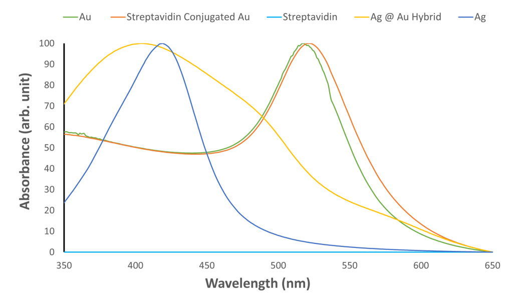 The UV-Vis spectra from 350 to 650 nm were collected and normalized with respect to their individual maximum measured absorbance for Au, Au-conjugated, Ag, Ag@AuNPs, and streptavidin particles (Fig. 2). The absorbance lambda max (λmax) determined is as 517 nm for Au, 522 nm for Au Conjugate, 404 nm for Ag@Au Hybrid, and 419 nm for Ag. Protein Streptavidin was found to have almost no absorbance for the entire spectrum. The Ag@Au hybrid particles exhibit a broad peak expanding throughout both the ranges of Ag and Au λmax wavelengths, indicating that the Ag@AuNPs have properties inherited from both AuNPs and AgNPs. With a λmax closer to the values of Ag, the properties of AgNPs are expected to be dominant over the properties of Au. However, an increase in the Au peaked absorbance region also shows the influence of the outer gold shell. AuNPs peak at around 517 nm, and Steptavidin-conjugated AuNPs peak at around 522 nm. The small difference between the two λmax demonstrates that the absorbance properties of AuNPs are retained despite the conjugation. This opens the possibility to numerous biomedical applications as protein conjugation can provide selective entrance into cells while keeping the light scattering feature.