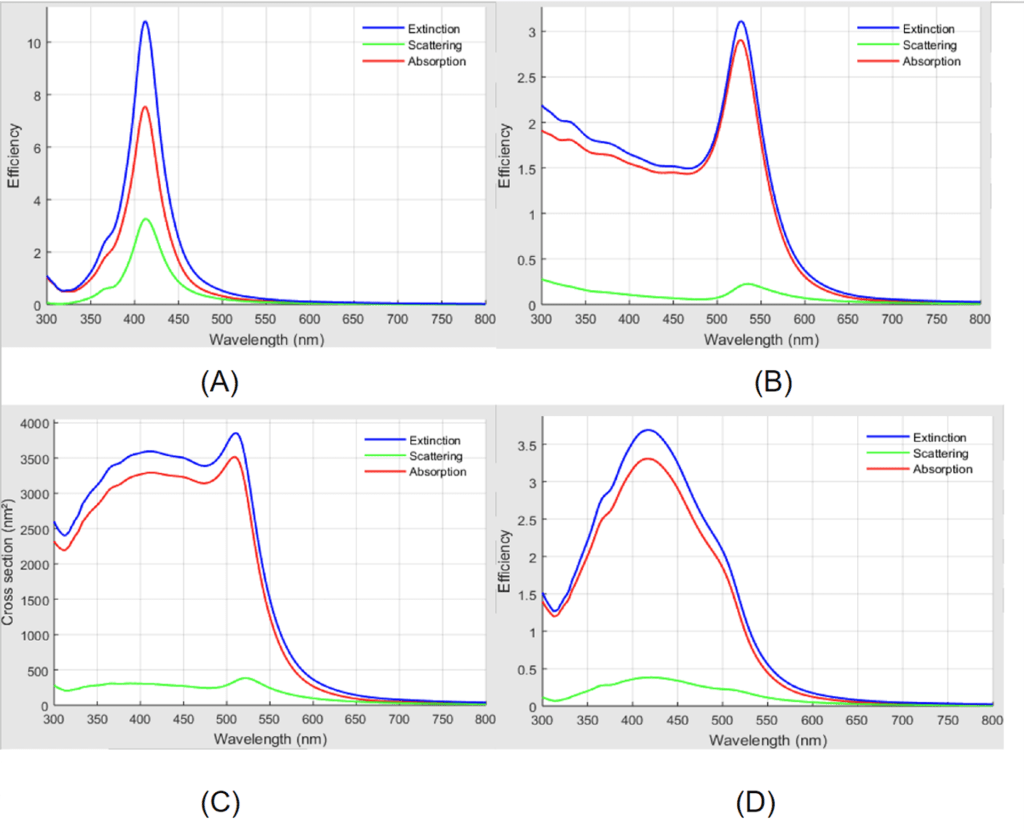 The normalized absorption spectra revealed the plasmonic peak of the different nanoparticles. However, the intensity of the light scattering effect for each nanoparticle is a substantial factor in the development of a possible PPTT treatment and effective usage in medical imaging. A simple Mie resonance-based simulation app is used to better understand the light interactions between different nanoparticles. We have used the NFMie program [18], and the results have been plotted in Figure 3. The red plots show the absorption of light impinging upon the nanoparticles, whereas the green plots illustrate the scattering phenomena. The extinction plots account for the total phenomena of absorption and scattering simultaneously. It is obvious that our 40nm diameter particles generate the plasmonic peak locations relatively around the expected wavelength observed in Figure 2 as an outcome of the UV-Vis measurements.