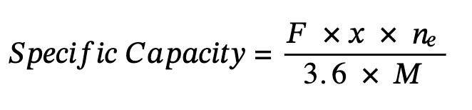 The battery capacity is determined by the mass of active material contained in the battery. In the case of Equation 1, the active material of the cathode is LiCoO2. The gravimetric specific capacity of a compound employed as an electrode is given by the following, Equation 2: