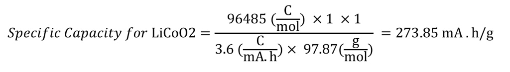 The theoretical specific capacity can be calculated based on Equation 2 for the case of LiCoO2 in our discussion, assuming 1e− oxidation per formula unit, as follows: