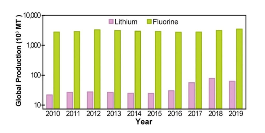 While LIBs are the prevailing battery technology today, their high demand has resulted in a depletion of metal lithium resources, which are low in abundance [1]. This means that new generational batteries must be developed to replace LIBs and allow modern life to function with the continuously high technological demand. Other key metal elements used in LIBs are also low in abundance-availability and are highly expensive to mine, such as cobalt and nickel [12]. This issue has motivated research for next-generation battery technologies that are more sustainable and efficient than LIBs. Current research on secondary battery technologies includes sodium batteries [13], magnesium [14], calcium [15], aluminum [16], chloride [17], and fluoride [18]. Fluoride-ion batteries (FIBs) are a highly attractive class of alternative battery technology where monovalent F– anions have a similar size/ionic radius to Li+ cations. FIBs are of particular importance because they pose sustainable alternatives to lithium, as F– anions are mined from the fluorspar mineral CaF2, a naturally occurring mineral that is abundant on Earth (Figure 1) [19, 20]. From Figure 1, the global production of fluorine is over 3.5 million tons per year, towering above the production (and consequently availability) of lithium by nearly two orders of magnitude [20]. The massive abundance of fluorine, along with this well-established supply chain are promising for the development of FIBs as a low-cost and sustainable alternative to LIBs. In addition, theoretically, FIBs can even outperform lithium batteries with energy density in the range of 550 Wh/kg for FIBs versus 300 Wh/kg for current LIBs [19]. The majority of battery research has been developed with cations serving as the working ions in batteries since scientists have established the fundamental principles for them and have a better understanding how to harness the electrochemical properties in the respective batteries. In contrast, much is unknown about harnessing anions as working ions in batteries. While LIBs operate with Li+ working cations, FIBs operate with alternative F– working ions inhering different (electro)chemistry from cationic working ions, that has yet to be elucidated and requires fundamental research.