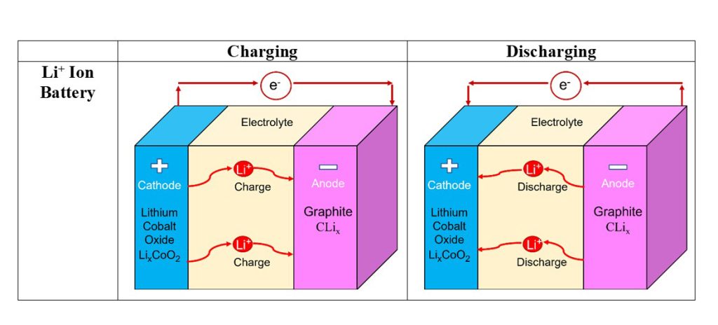 In a rechargeable battery, the electrodes are separated with an electrolyte that transfers ions back and forth between the two electrodes through an external circuit, causing the battery to charge and discharge. The anode is the electrode where oxidation occurs during the discharge, and the cathode is the electrode where reduction occurs. The mnemonics “An Ox” and “Red Cat” can be used as a helpful way to remember this convention. Figure 2 illustrates a LIB during discharge, where chemical energy is converted into electrical energy spontaneously, leading to the movement of electrons from the anode to the cathode. During charge, the electrical energy is converted into chemical energy upon applying a voltage to the battery. Now, the oxidation reaction occurs at the cathode and the reduction reaction at the anode (Figure 2). Although the opposite reaction occurs at each electrode, the scientific terminology keeps the designation of the electrodes (anode and cathode) as defined for the spontaneous discharge reaction.