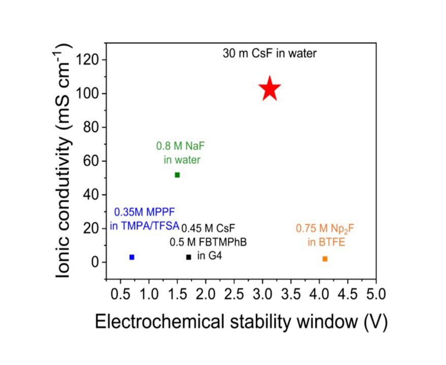 Lastly, within this second category of FIB liquid electrolytes, fluoride salts in aqueous solutions can consist as a subcategory of dissolving metal fluoride salts in solvents [33, 51]. A study employing a NaF salt solution as a liquid electrolyte to assemble a FIB cell was studied [51]. The electrochemical data demonstrated stable battery cycling performance, where the authors claim at least 85 cycles of charge/discharge [51]. This year, it was reported that an aqueous CsF electrolyte solution exhibited high solubility, an incredibly high room-temperature conductivity of 152 mS/cm, and (electro)chemical stability, which has been absent in most FIB liquid electrolytes [34]. Figure 4 depicts comparatively the ionic conductivity and electrochemical stability window of select FIB liquid electrolytes [34]. The electrochemical stability window is the voltage cell potential window in which the electrolyte is stable electrochemically and does degrade to produce byproducts. The high (electro)chemical stability window of 3.1 V of this aqueous CsF electrolyte solution is promising in enabling high operating voltage electrodes that can be maintained stable [34]. Moreover, it is encouraging that the initial cycling performance of FIB cell in a concentrated solution of the aqueous CsF electrolyte demonstrated high retention of its capacity, permitting a more stable cycling performance of FIB at room temperature [34]. Also, it showed suppression of the dissolution of the electrode materials, providing a positive trajectory for the reversible cycling of FIB in liquid electrolytes.