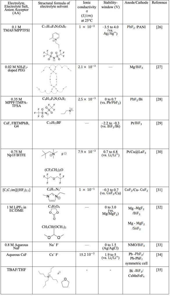 A primary difference between LIBs and FIBs is the preparation of their liquid electrolytes. The liquid electrolytes for LIBs typically consist of lithium salts such as LiPF6 dissolved in organic solvents. However, in the case of FIBs, metal fluoride salts (e.g., KF, CsF) are not soluble in non-aqueous and organic aprotic solvents. Based on the literature, there are three general strategies for preparing fluoride-ion conducting liquid electrolytes: (i) mixing organic fluoride salts into ionic liquids, (ii) dissolving fluoride salts in organic or aqueous solvents, including the use of anion acceptors and (iii) employing electrolytes that can contain F– ions in true anhydrous form, without transformation of F– into HF2– upon dissolution in solvent. We provide an assessment of recent work on liquid electrolytes in FIBs, concisely summarized in Table 2 with an outline of the anode, cathode, and liquid electrolyte materials to analyze comparatively the developments and improvements of liquid electrolytes for next-generation FIBs.
