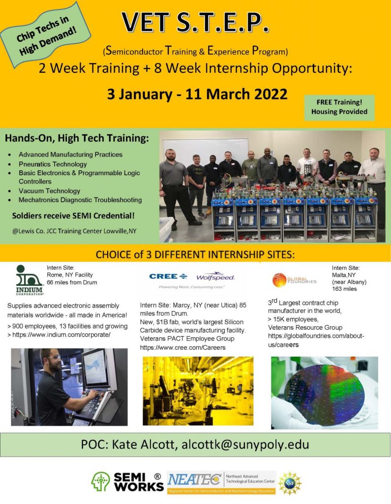Housed at SUNY Polytechnic Institute in Utica, NY: the Northeast Advanced Technological Education Center (NEATEC) mission is to attract and train a technician workforce for the semiconductor/advanced manufacturing industries. Read more about Associate Director Kate Williams Alcott’s work to recruit veterans and transitioning military members who are interested in nanotechnology training and jobs. If you are a veteran or active duty military member in transition, check out this upcoming program that still has seats available (at publication) – the flyer has all the info for the January workshop including info on the companies that are interested to hire.