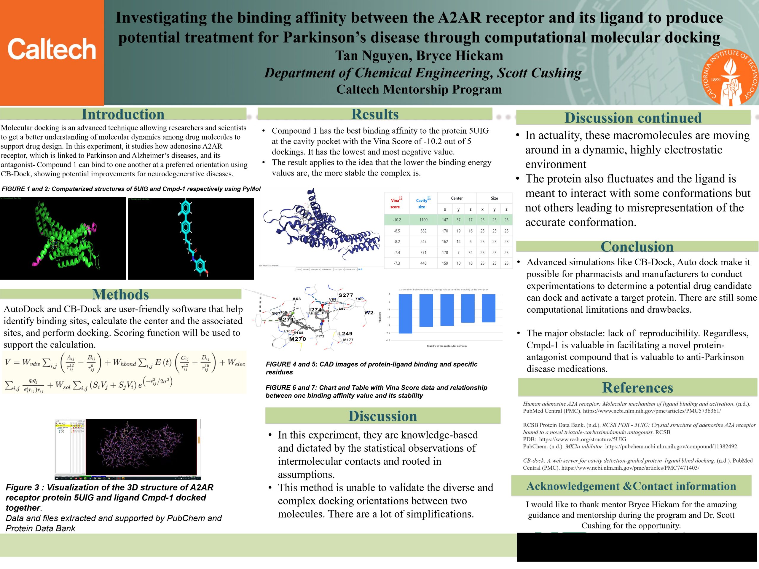 Molecular docking is an advanced technique allowing researchers and scientists to get a better understanding of molecular dynamics among drug molecules to support drug design. In this experiment, it studies how adenosine A2AR receptor, which is linked to Parkinson and Alzheimer’s diseases, and its antagonist- Compound 1 can bind to one another at a preferred orientation using CB-Dock, showing potential improvements for neurodegenerative diseases.​